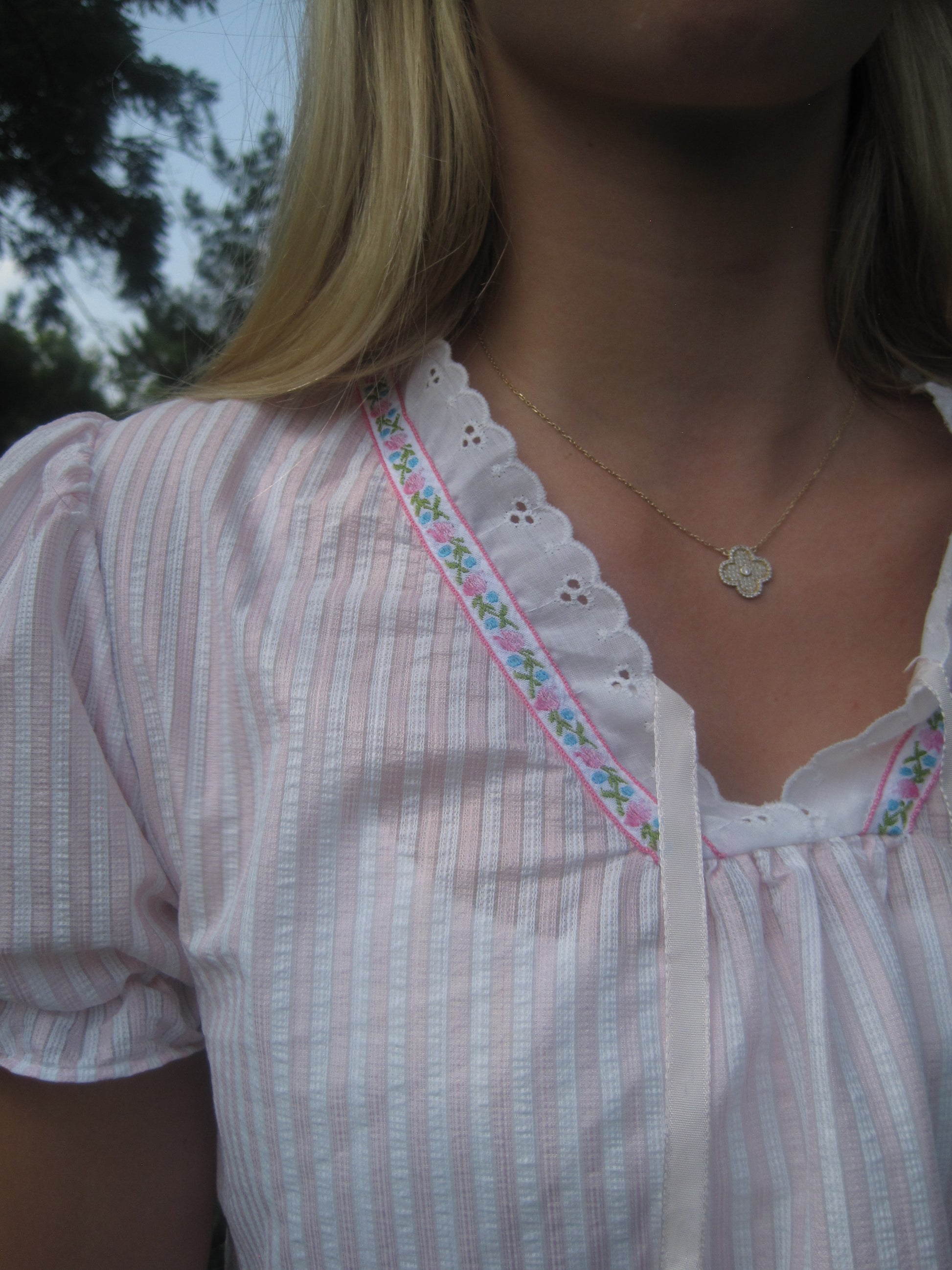 This cropped coquette top is a summer staple. It is so light weight but adds a touch of style and aesthetic. The puffer sleeves and lace detail make this a need!